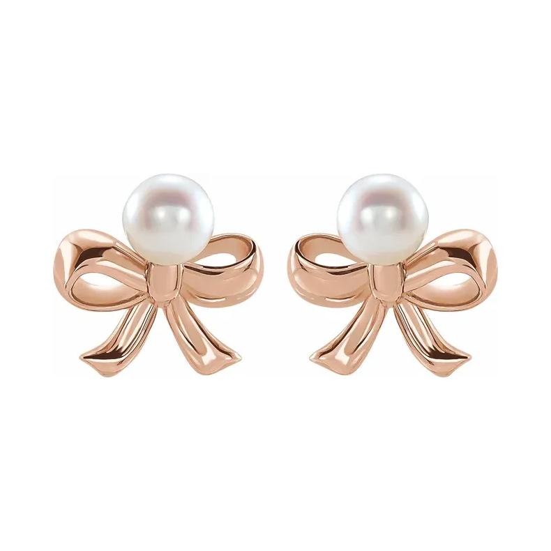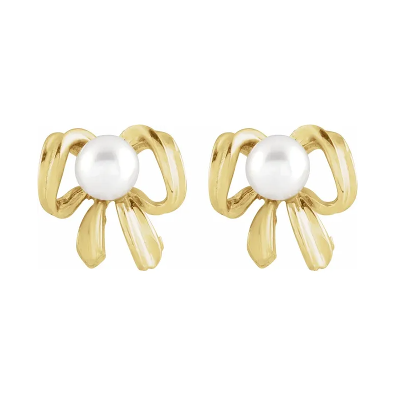 14K Gold Cultured White Akoya Pearl Bow Earrings